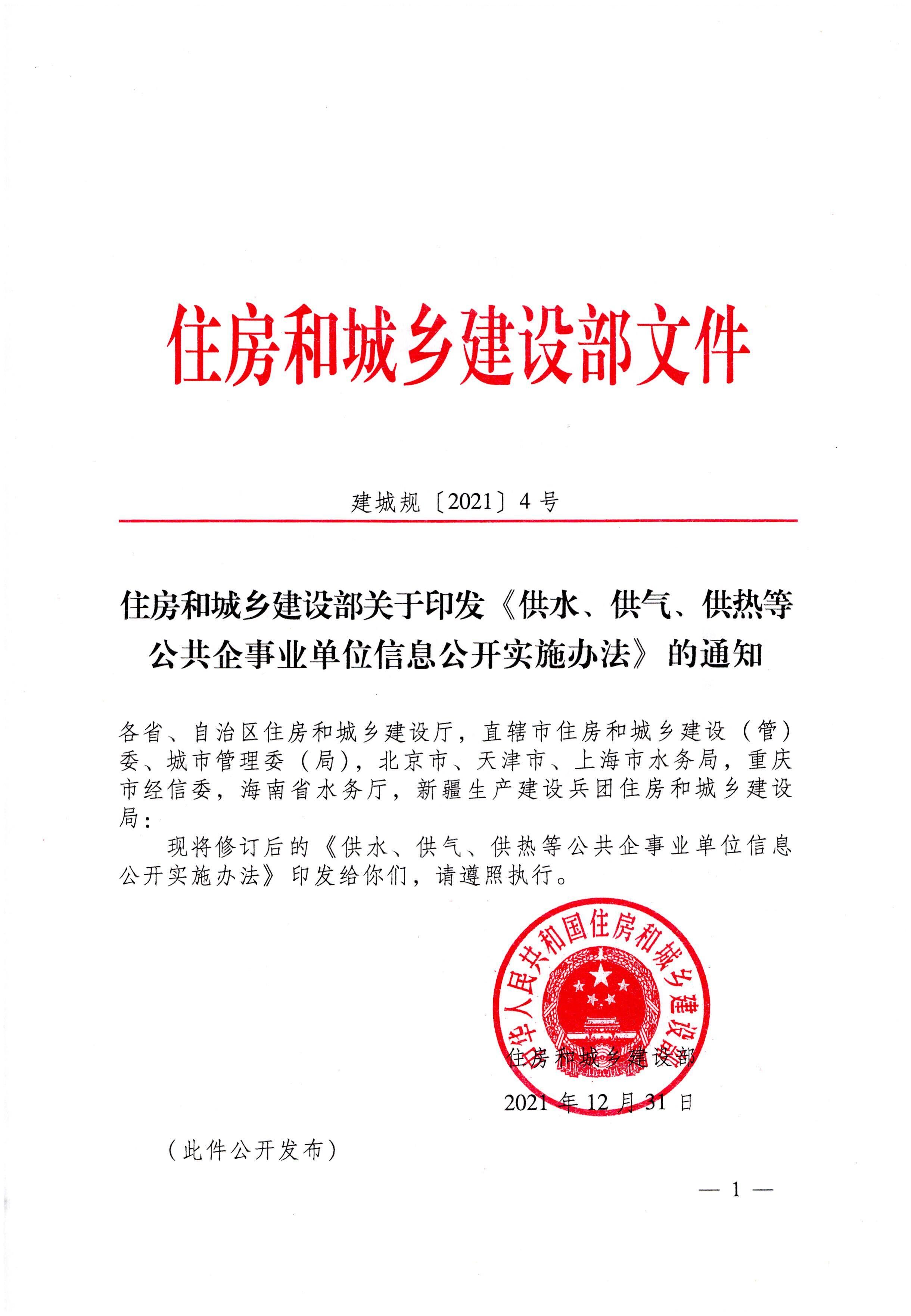 住房和城乡建设部关于印发《供水、供气、供热等公共企事业单位信息公开实施办法》的通知