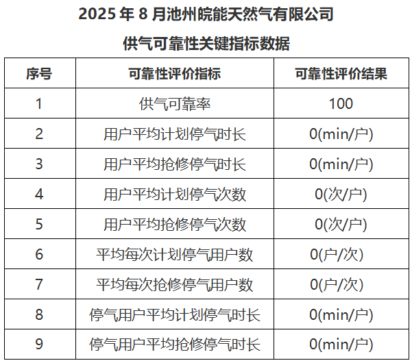 2025年8月供气可靠性关键指标数据