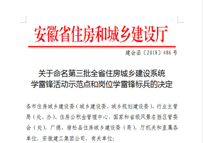 近日,安徽省住房和城乡建设厅下发了《关于命名第三批全省住房城乡建设系统学雷锋活动示范点和岗位学雷锋标兵的决定》(建会函〔2018〕486号),广德皖能公司荣获“全省住房城乡建设系统学雷锋活动示范点”称号。