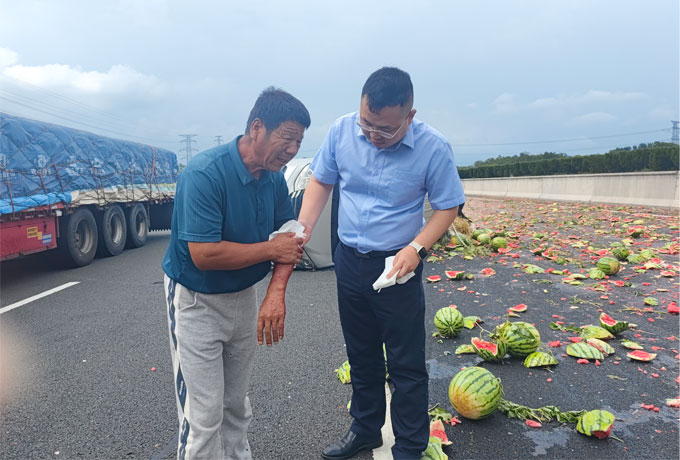 下午2时许,皖能港华公司员工黄虎、周雅芳、胡瑞驾车从合肥返回宁国途中,行至芜合高速含山出口附近时,发现前方一辆单排银色货车侧翻在第二车道,长达200米的路面上满是摔碎的西瓜,此时高速车流较大,现场情况紧急。他们减速通过时,发现货车驾驶员被困在车内,危急时刻,他们迅速将车辆停靠在应急车道,做好安全警示等应急处置后,立即展开救援。透过车窗观察到,被困驾驶员是一位六旬老人,其左臂受伤出血不止,因车辆侧翻,老人无法自行脱困,加之当时气温达32度,车厢内闷热,伤者情况危急。见状,胡瑞快速爬上货车驾驶室顶部,打开车门,与其他人一起把受困司机救出,并转移至相对安全区域。同时,立即拨打96566高速救援热线和120急救电话,一会,高速救援人员赶到,详细交接现场情况后,他们才放心离开。