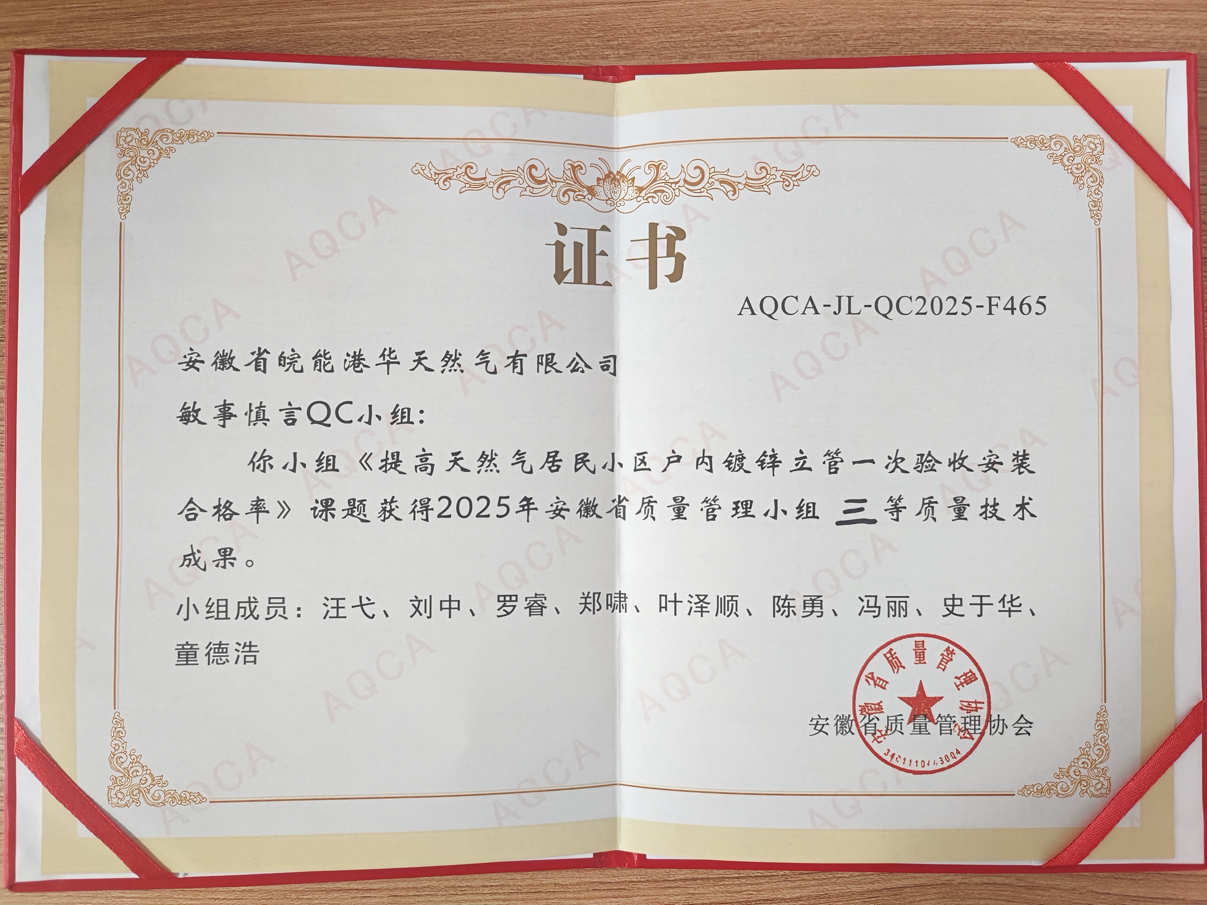为确保活动取得实效,公司QC小组前期深入调研,精心组织,强化过程管控,按照活动流程,稳步开展小组活动。在2025年安徽省质量管理小组活动交流会暨成果发表赛中, 皖能港华公司提交的成果文件因形式规范、内容扎实,得到了评审专家一致认可,获得了安徽省质量管理小组三等质量技术管理成果。